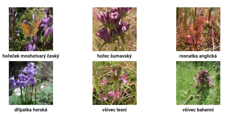 Mezi vzácné rostliny patří například hořeček mnohotvarý český nebo hořec šumavský, který je svým názvem vázaný právě na toto území. V mokřadech najdeme masožravé rostliny jako rosnatku anglickou či tučnici obecnou, které si vypestují chuť na hmyz. K vzácným druhům patří také kyhanka sivolistá, dřípatka horská, různé druhy všivců či borovice blatka a bříza trpasličí.
