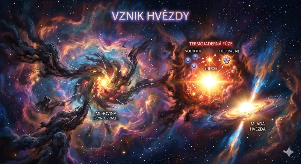 Hvězdy vznikají v obřích mračnech plynu a prachu (mlhovinách). Gravitační síla postupně stlačuje materiál do hustšího jádra. Když teplota a tlak vzrostou dostatečně, spustí se termojaderná fúze vodíku na helium – a zrodí se hvězda na tzv. hlavní posloupnosti.